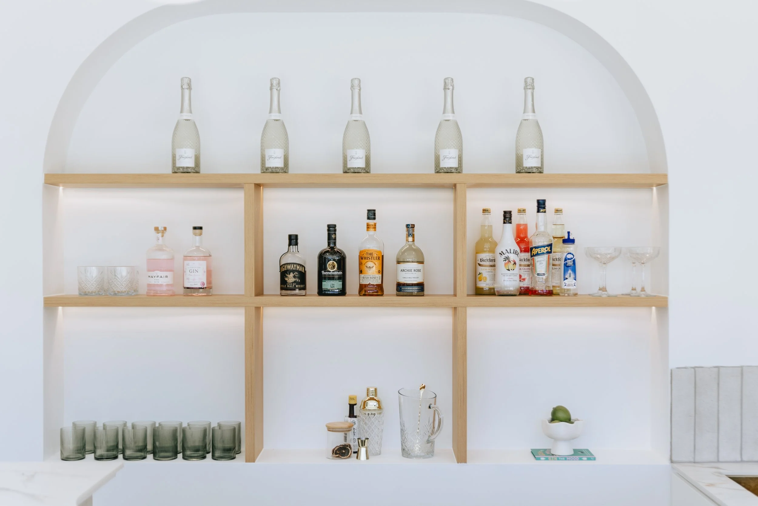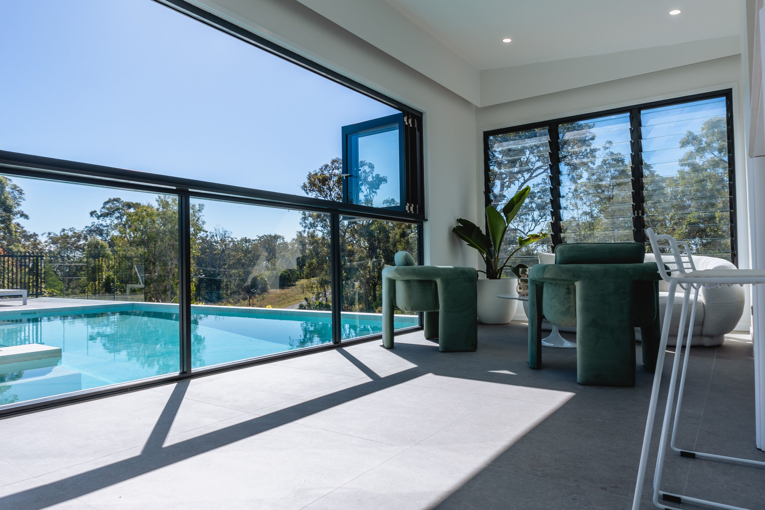 Floor to ceiling sheer curtains, large bi-fold windows and stacked glass doors enable a space that is both vast and intimate. Open wide to reveal uninterrupted views of the pool and surrounding nature, or close it up and appreciate the details of the lounge, bar and bathroom.