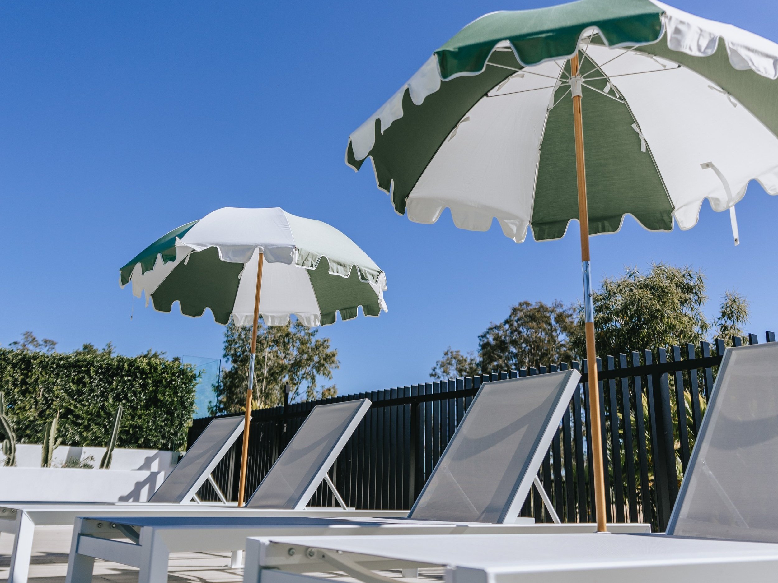 The deck is framed by a variety of materials, most notably the cactus garden and hedge. Make use of the wide bench seat or shoot beneath the open sky on the sun-lounges.